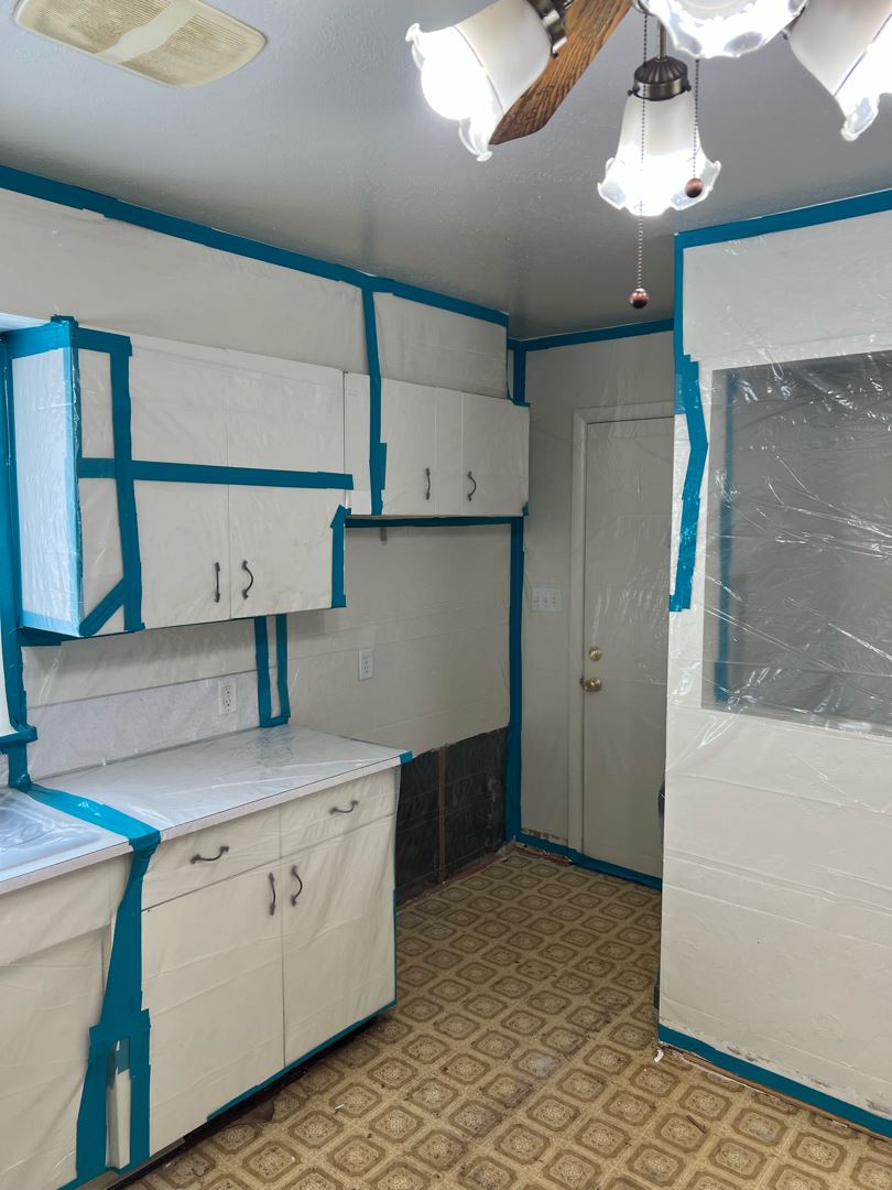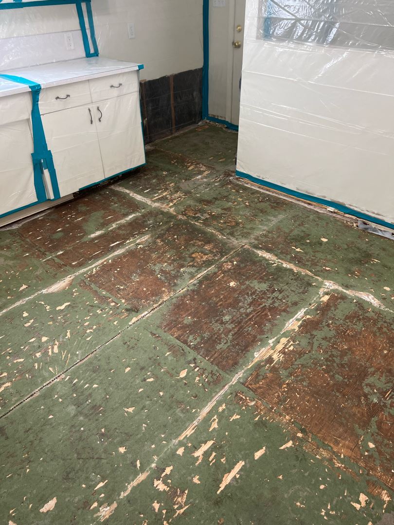 The containment barrier has been completed, and the area is ready to remove the vinyl flooring.