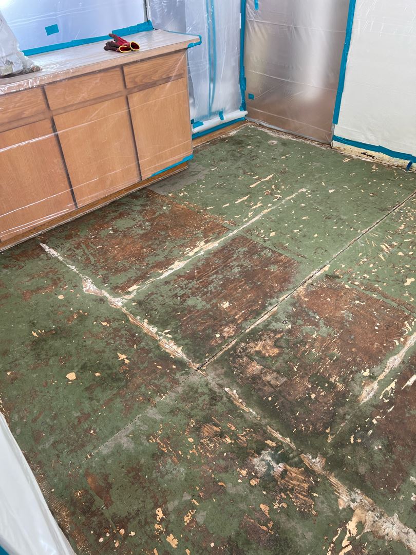 Containment wall in the process of being set up in preparation to remove the vinyl flooring. This is done by putting up thick plastic and strong duct tape to prevent any dust from entering other parts of the structure.