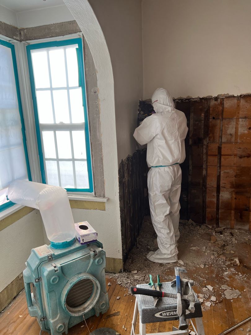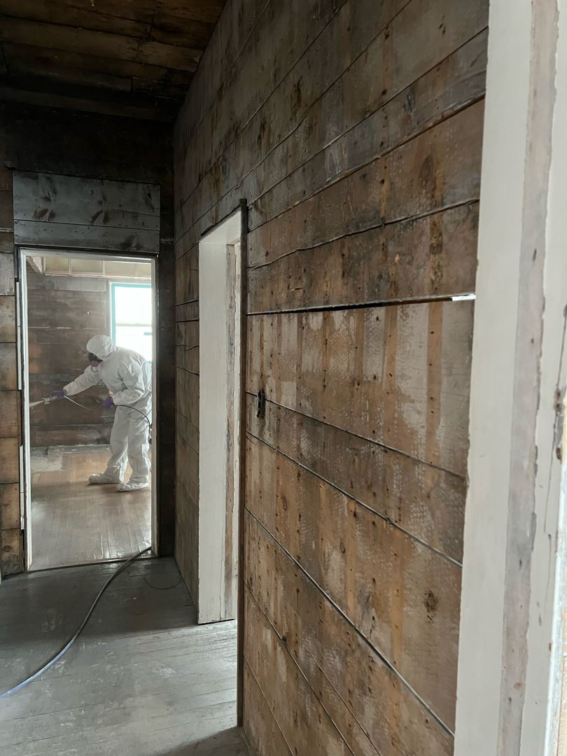 Abatement in progress – removing plaster on walls. There is an air scrubber on all jobs to vent the air outside to help minimize dust in the air within the work area.